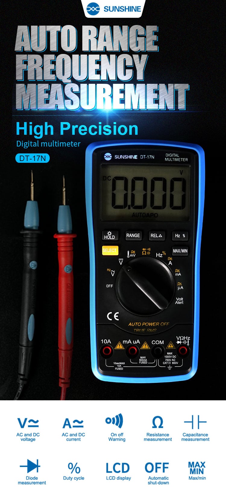DT-17N is 35/6 automatic digital instrument, is a stable performance, high precision, high reliability; with battery-driven automatic digital multimeter, the instrument adopts 21mm high LCD display, clear reading; About 15 seconds delay backlight, high pressure alarm and overload protection .It will more convenient to use.